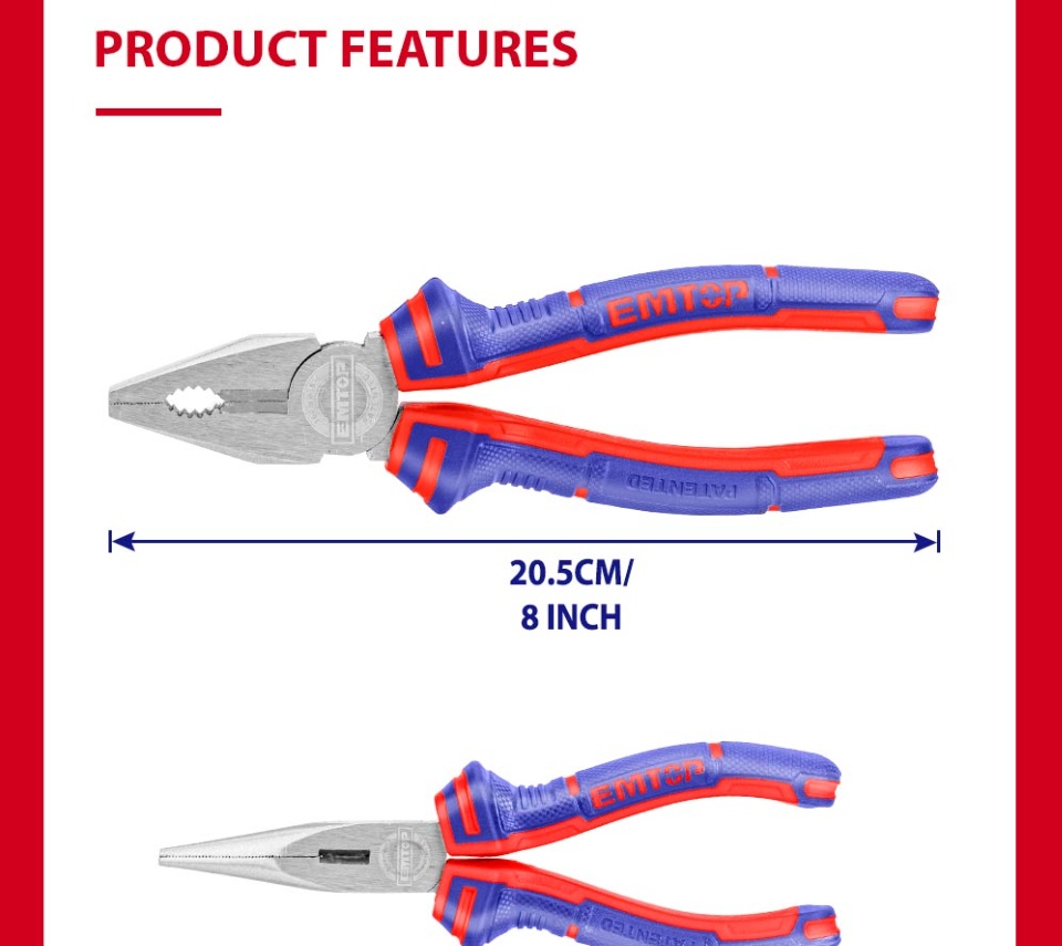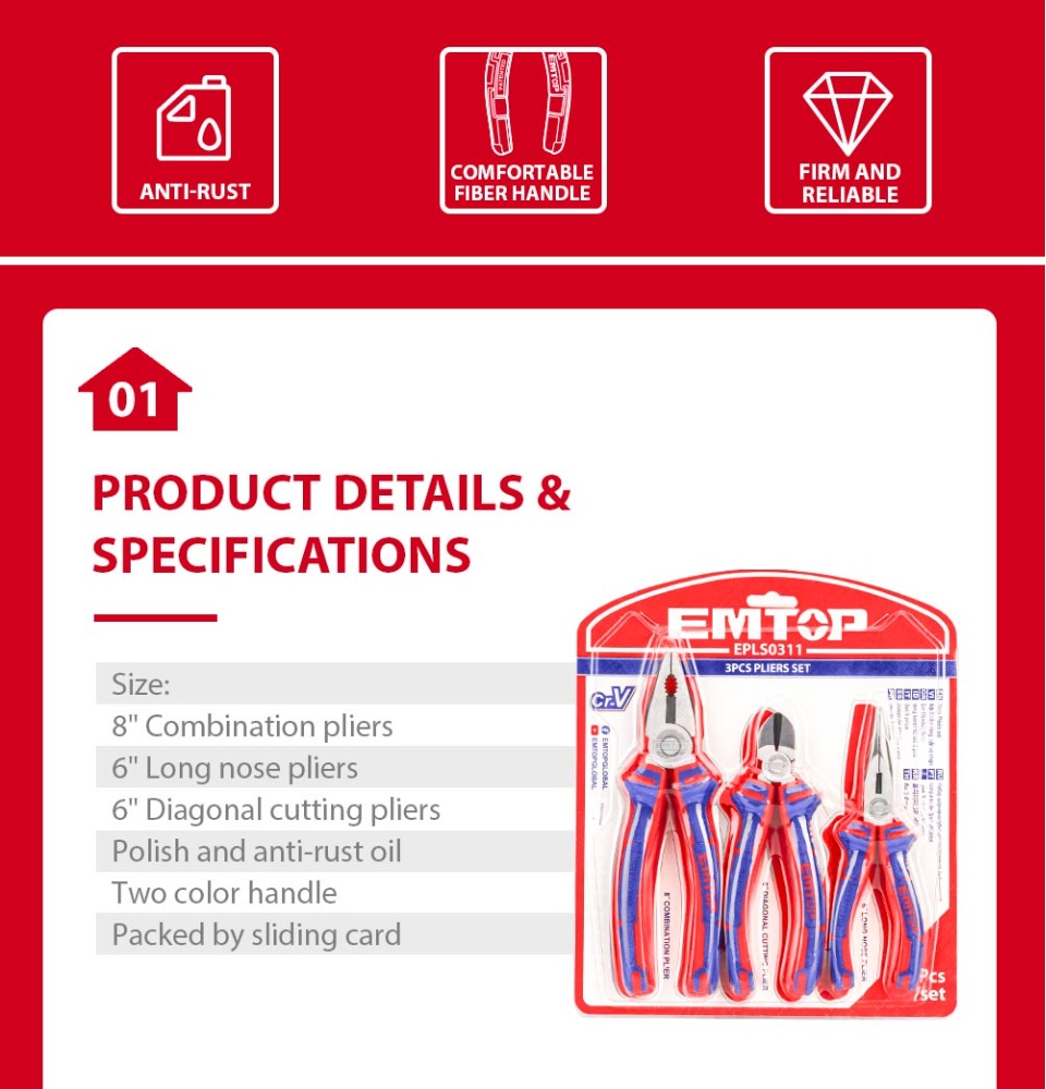 EMTOP 3PCS钳子套装,8英寸组合钳子,6英寸长鼻钳,6英寸对角线切割钳多功能钢丝钳EPLS0311
