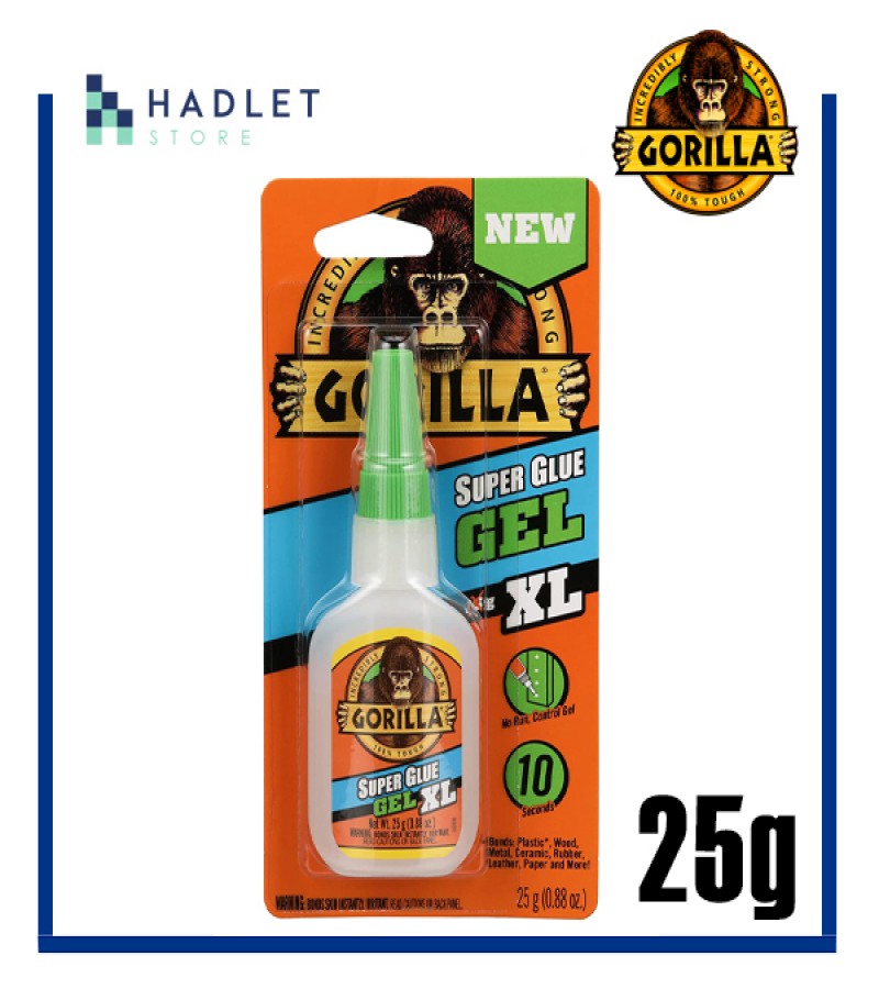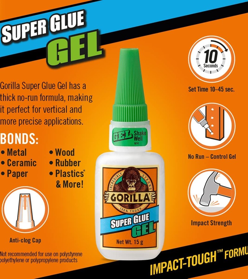 Gorilla Super Glue Gel is an easy-to-use, thicker and more controlled formula great for multiple surfaces and vertical applications. Developed for long-lasting repairs in an instant, the clear glue dries in 10–45 seconds. This super glue gel is specially formulated to absorb drops, impacts and shocks. Super glue, also referred to as cyanoacrylate glue, or CA glue, works on a variety of materials, including plastic, metal, fabric, stone, ceramic, paper, rubber and more.