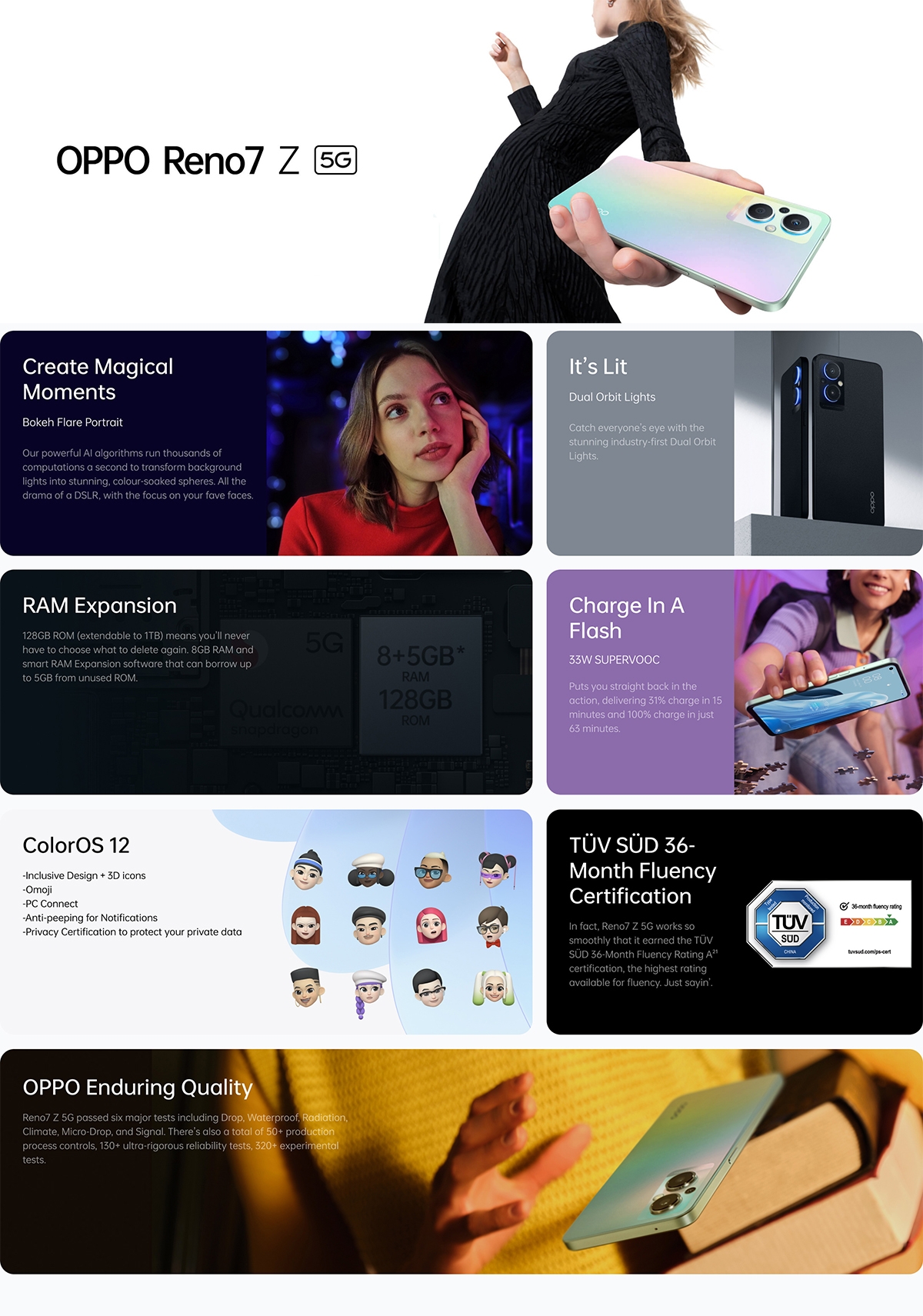 Reno7 Z 5G is powered by the Qualcomm® Snapdragon™ 695 5G Mobile Platform1, equipped with Bokeh Flare Portrait and Selfie HDR imaging features, and complemented by the industry-first Dual Orbit Lights. Together with OPPO’s signature OPPO Glow design, Reno7 Z 5G is a 5G smartphone with professional portrait photography capabilities designed to capture your diverse lifestyles.