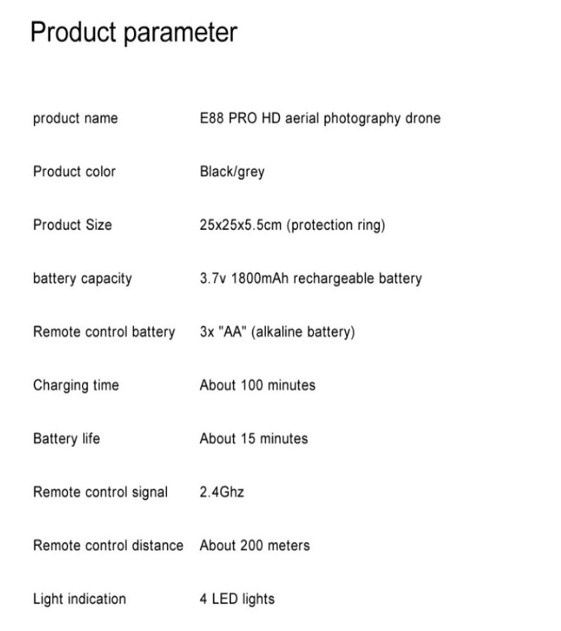 Functions: up/down, forward/backward, left/right, side flight, three-level flight speed, LED lights, headless mode, one-key automatic return, altitude hold mode, WiFi FPV, path flight, camera